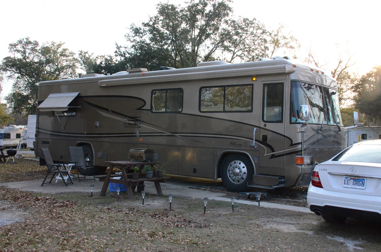 DAY 1 – We left on Wednesday, December 26, 2012 at 5:00 am (we would call this …dark thirty). It was really dark and raining…we were happy the bay area traffic was holiday light and we were able to get through the Bay bridge maze with no trouble. We got to highway 99 and worried for a minute as the sun was rising and the rain was moving on…the fog started to form…we were thankful, the fog stayed light so we could see. We got to I-5 the grapevine…this is always tough in the motorhome and this trip we have the trailer…we are a big load. We felt like we were storm chasers as the clouds in front of us made us nervous as we watch the temperature drop as we climbed the grapevine. We did make it over and down the grapevine, with rain and traffic off and on…it was a long day. We drove 550 miles today…made it to camp in the dark and in the rain…day one done.